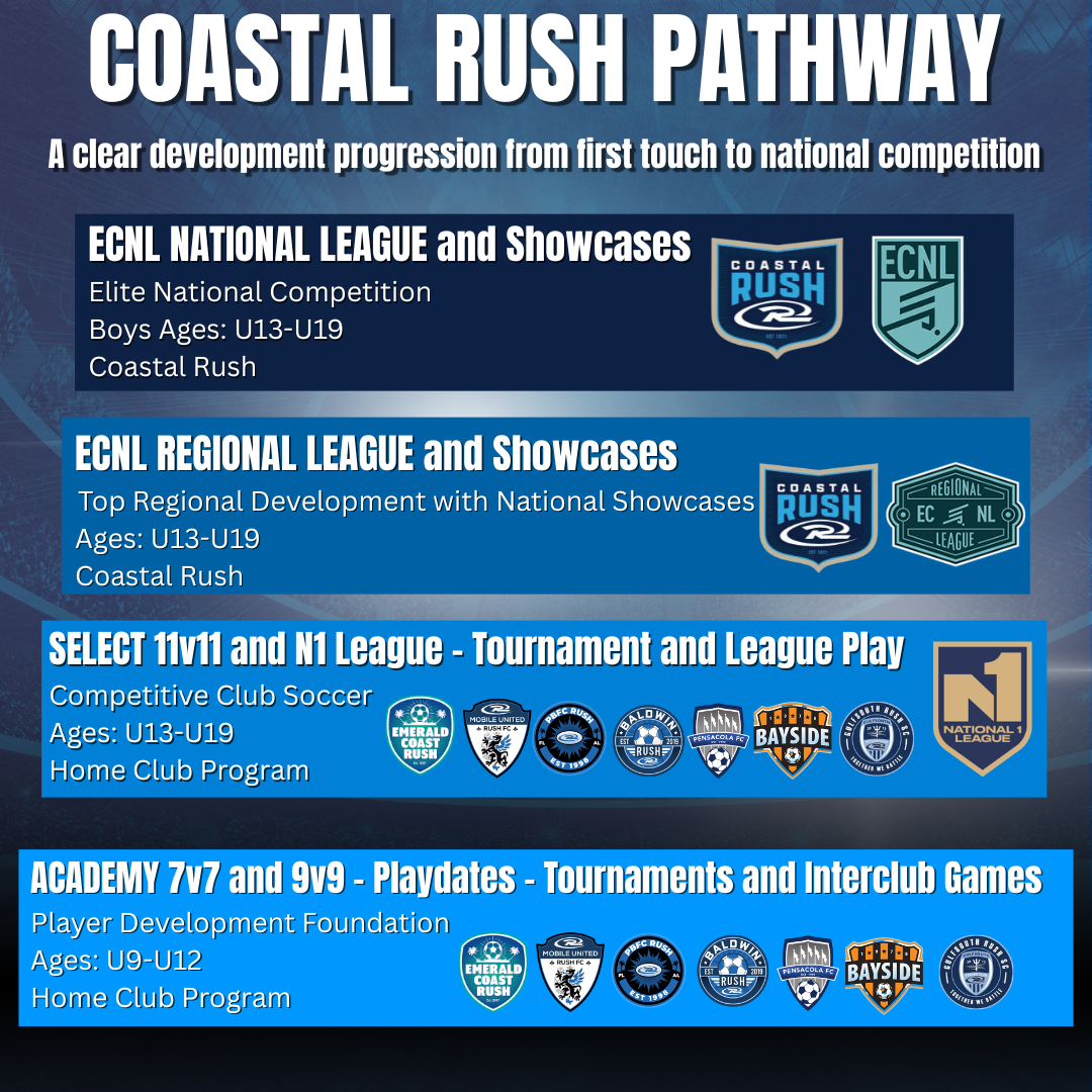 For the area's top girls players, Coastal Rush fields teams in the ECNL Regional League (RL) Girls, one of the most respected youth soccer leagues in the country, offering high-level competition against top clubs across the region. They will play in the Gulf Coast RL League and compete in National ECNL and ECNL-RL Showcases.